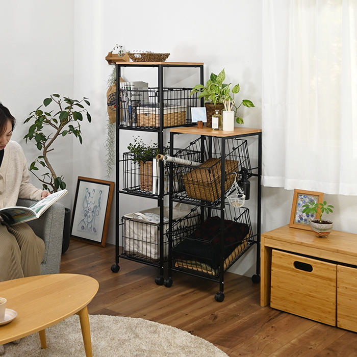 ものが溢れやすいリビングを収納ラックを使用して整頓。